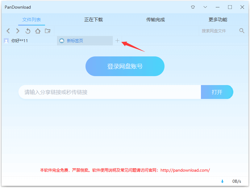 ①运行软件后首先需要登录百度账号,在新标签页点击登录网盘账号按钮,输入用户名和密码点击登录即可,也可以使用QQ、微博等第三方账号登录